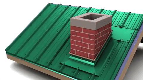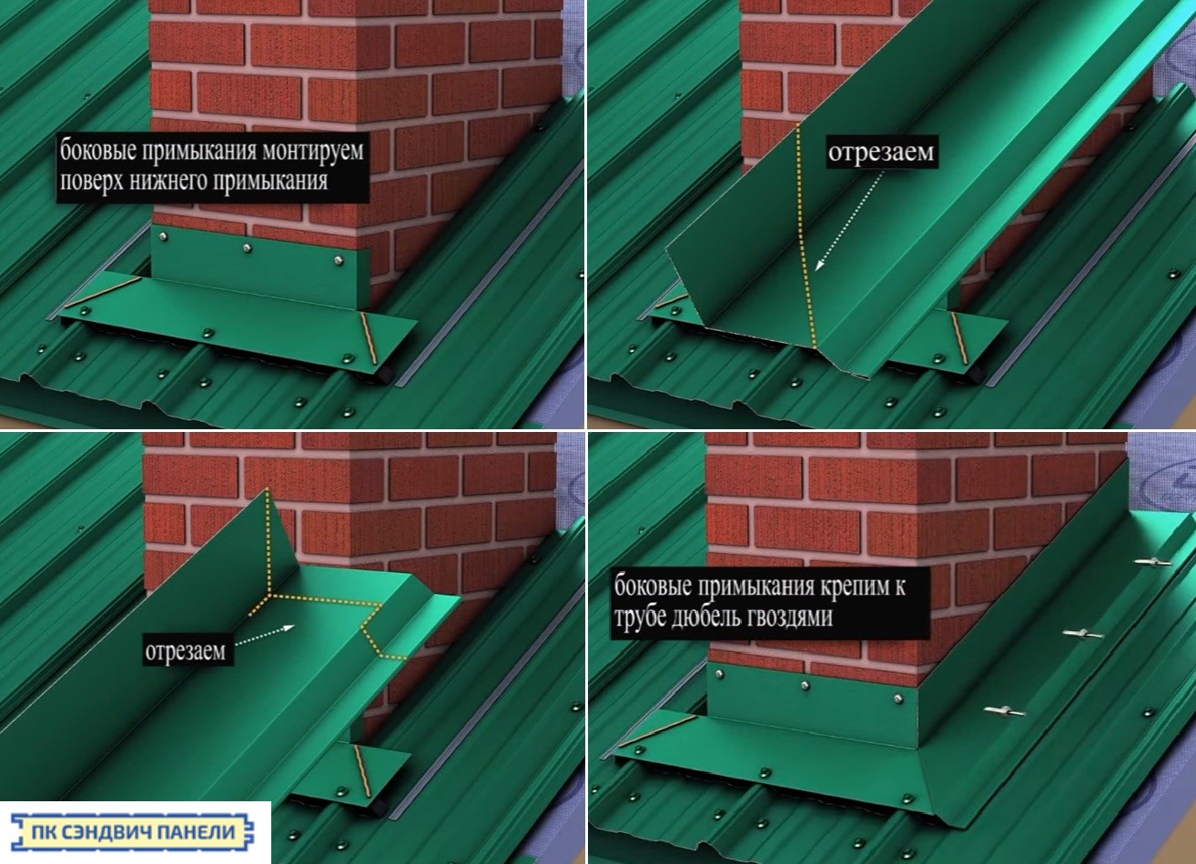 - Сначала оформляется верхний край примыкания, то есть планка, расположенная под трубой. Затем с помощью саморезов внахлест фиксируют торцевые планки. В последнюю очередь устанавливается деталь, расположенная над трубой, то есть выполняется монтаж нижней планки примыкания кровли.