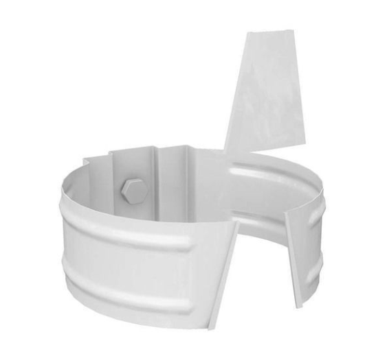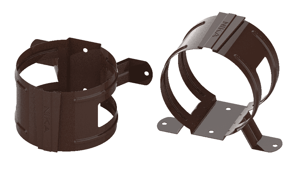 Держатель трубы D100 (на дерево) сделана из оцинкованной стали 0.6 мм толщиной. В качестве защитного барьера от солнечного света, механических повреждений, осадков применено покрытие Пластизол двусторонний. Такая система подходит как для частного дома, так и для индустриальных объектов. Она долговечна, экономична и эффективно отводит воду с кровли.