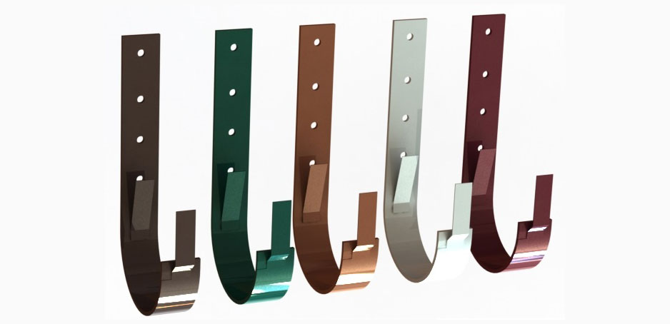 Длинные. Представляют собой элементы в виде крюков с длинной монтажной планкой. Имеют специальные монтажные планки, которые дают возможность крепить элементы к обрешетке или стропильным ногам. Такая фиксация значительно увеличивает прочность водоотвода. Конструктивная особенность повлияла на технологию кровельных работ - крюки обязательно устанавливаются до монтажа кровельных покрытий. В некоторых случаях их следует фиксировать и до начала изготовления обрешетки. Конкретное решение принимает мастер-кровельщик в зависимости от типа крыши и особенностей покрытий.