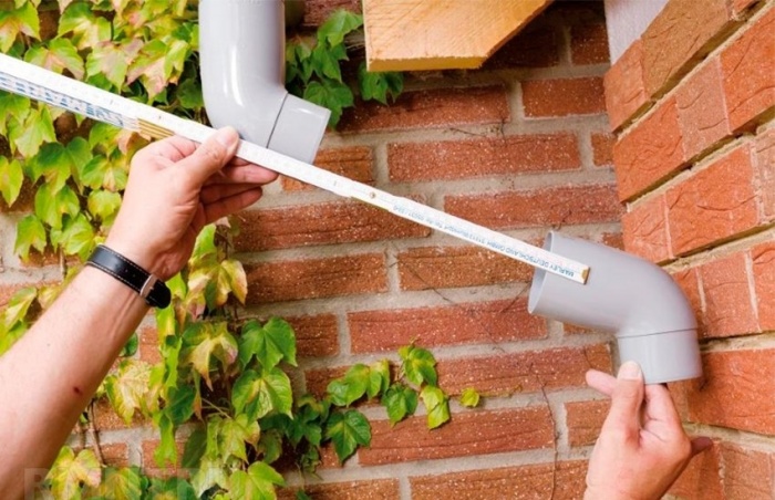 - зачастую некоторые конструкции мешают монтажу водостока, и для обхода таких элементов требуется пустить трубу под определенным углом (сделать это можно с помощью колена отвода);