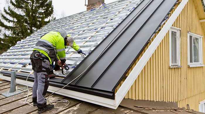 - Начните с нижней части крыши, устанавливая панели внахлест и фиксируя их. Сформируйте фальцы по краям панелей.