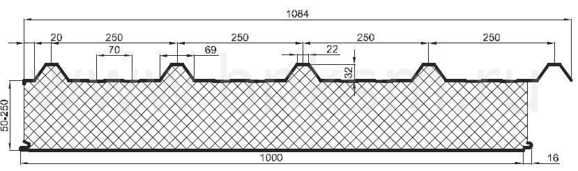 Сэндвич-панели кровельные с минеральной ватой отличаются высоким уровнем огнестойкости, к тому же имеют высокую плотность и теплопроводность 0,05Вт/(м*К). Это элементы со средним весом и такой же стоимостью, которые благодаря своему негорючему наполнителю используются практически повсеместно. Наружный металлический слой крышного утеплителя имеет обязательное профилирование в виде волны, микроволны, трапеции или накатки. Это важно в том случае, если полотно имеет большую длину и требуется основательно повысить его жесткость.