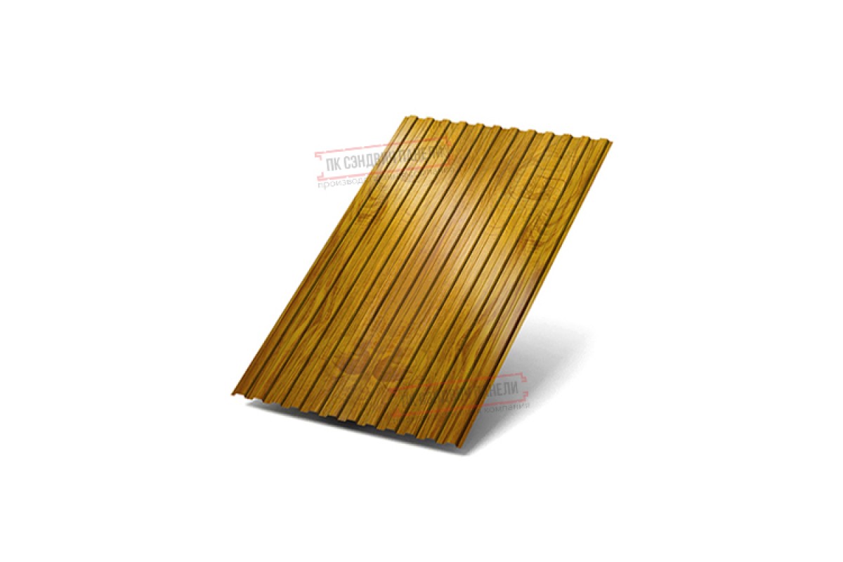 Профилированный лист МП10х1100 ECOSTEEL_T-ЗолотойДуб-0.5 — стальные листы холодного проката толщиной 0.5 мм, обработанные декоративно-защитным покрытием Экостил текстурированный. Это отделочный материал, который применяют для монтажа фасада особенно в стиле хай-тек. Профилированный лист МП10х1100 ECOSTEEL_T-ЗолотойДуб-0.5 пользуется спросом в Колпино по причине своей экономичности и практичности. При покупке материала обращайте внимание на рельеф: чем более он усилен, тем жёстче профлист.