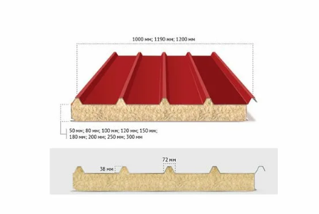 Сэндвич-панели кровельные с минеральной ватой отличаются высоким уровнем огнестойкости, к тому же имеют высокую плотность и теплопроводность 0,05Вт/(м*К). Это элементы со средним весом и такой же стоимостью, которые благодаря своему негорючему наполнителю используются практически повсеместно. Наружный металлический слой крышного утеплителя имеет обязательное профилирование в виде волны, микроволны, трапеции или накатки. Это важно в том случае, если полотно имеет большую длину и требуется основательно повысить его жесткость.