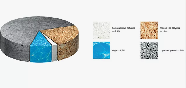 • Влагостойкость: за счет склейки древесной щепы портландцементом сип-панели не боятся влаги, материал хорошо переносит увлажнение, климатические нагрузки;
