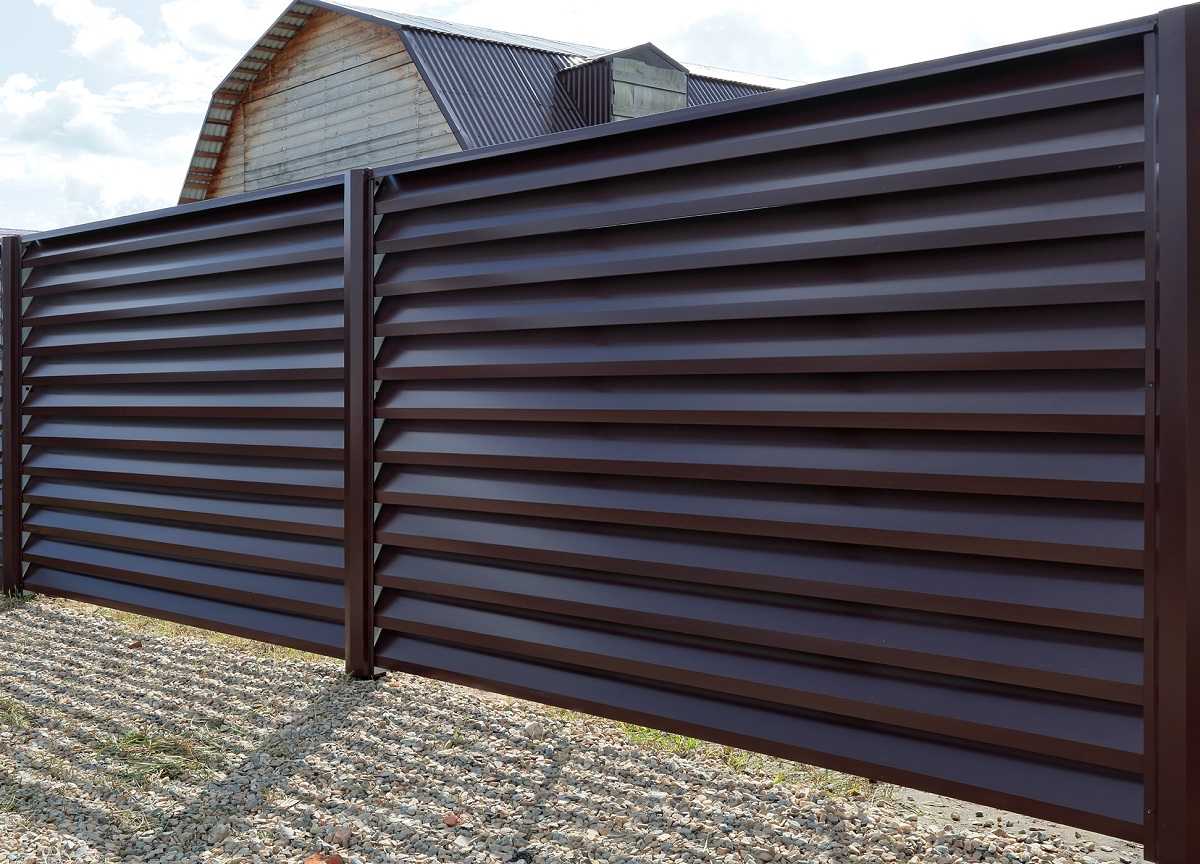- Конструкция заборов-жалюзи отличается прочностью и отлично выполняет функцию защиты территорий. Снаружи видимость участка ограничена, в то время как изнутри обзор возможен.