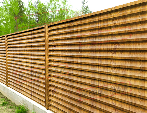 Жалюзийное ограждение состоит из металлических горизонтальных узких панелей-ламелей, расположенных на расстоянии друг от друга, зафиксированных на опорных столбах. Такой горизонтальный забор из металлического профиля пропускает воздух и солнечный свет на участок и, вместе с тем, создает шумовой барьер и обеспечивает защиту территории от проникновения посторонних.